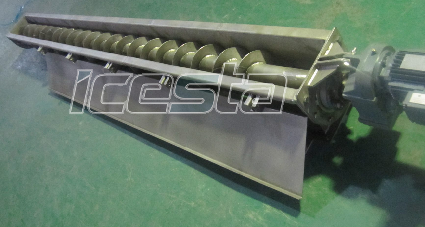 The screw conveyor below the ice deflector take charge of the ice which raked out from bin delivering to the snow maker