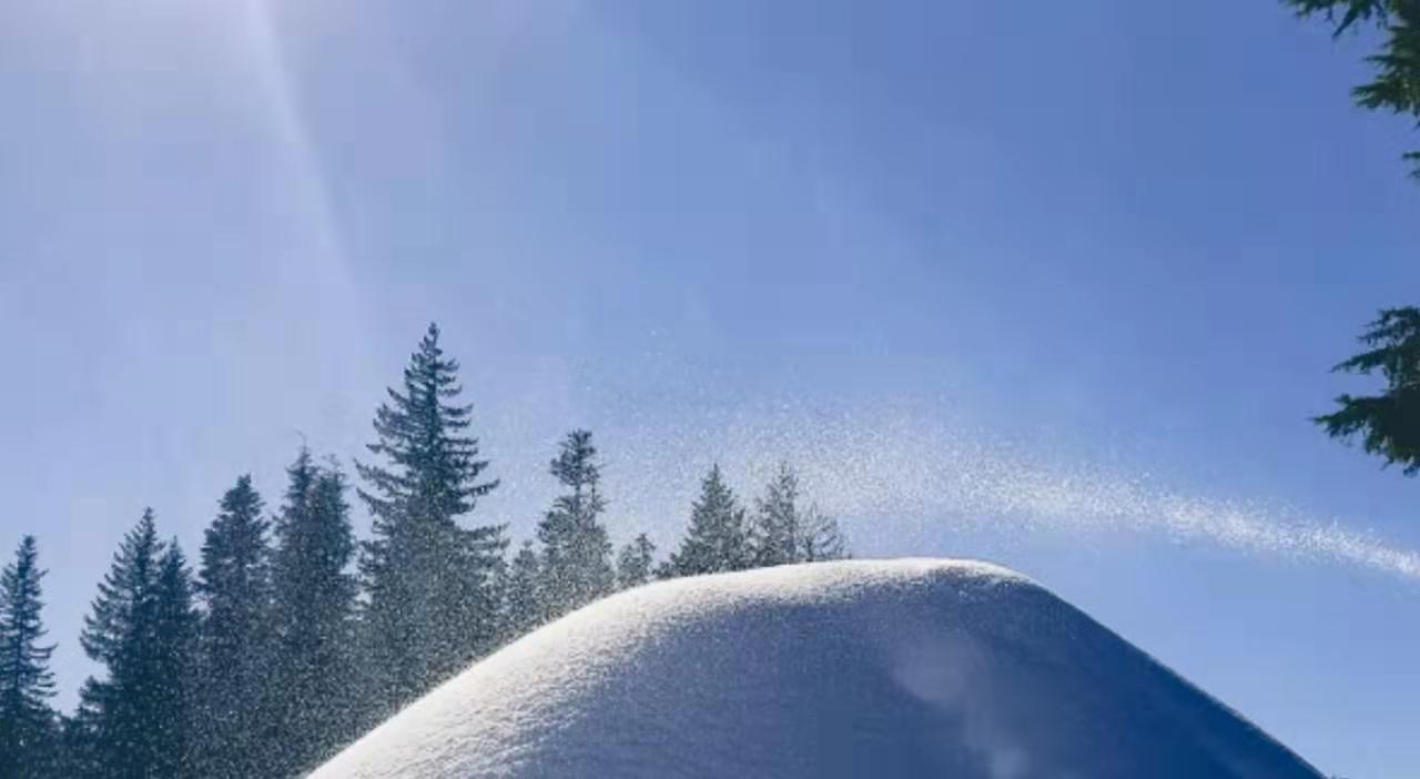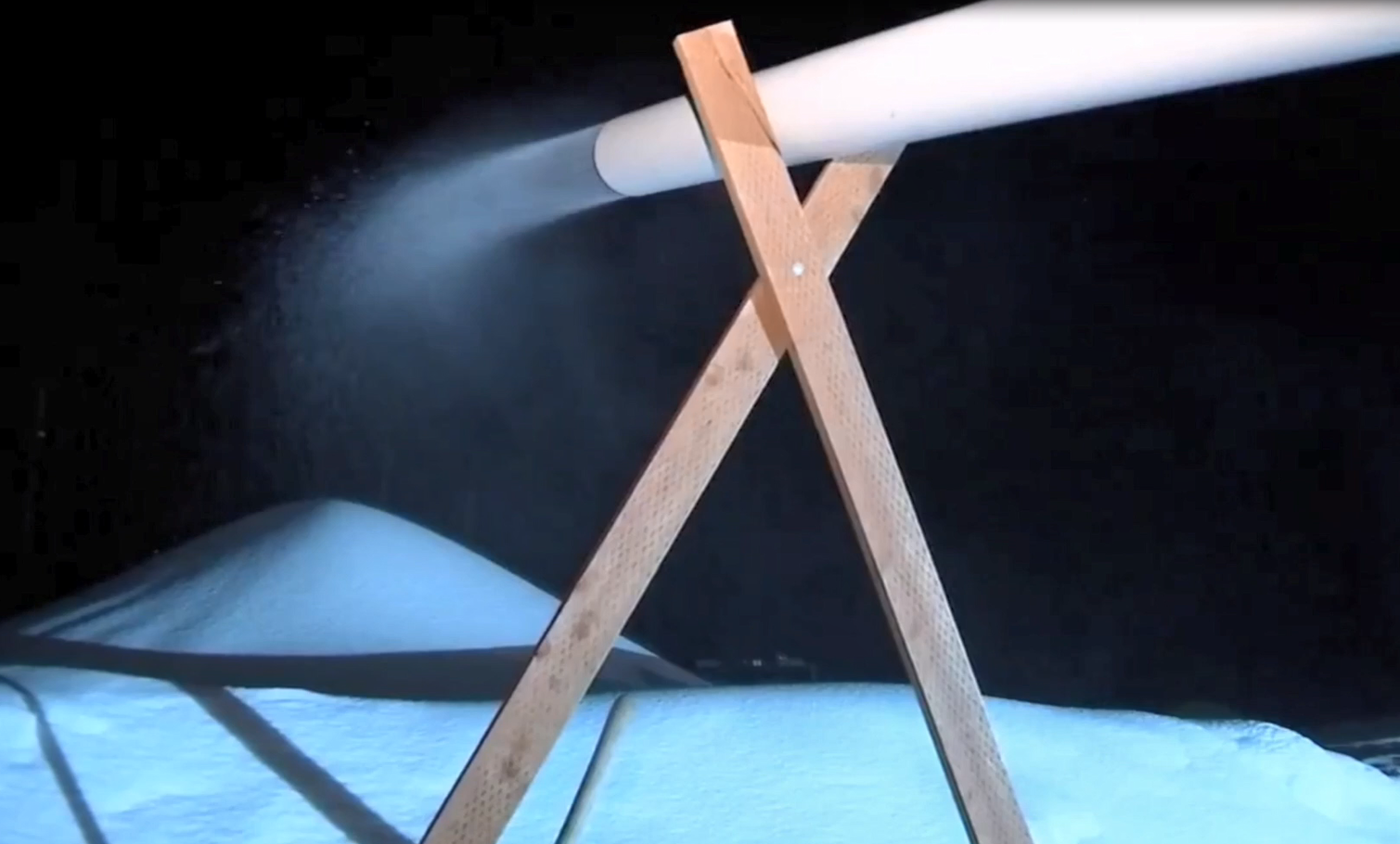 Making snow from flake ice then blowing snow to 15-meter distance.