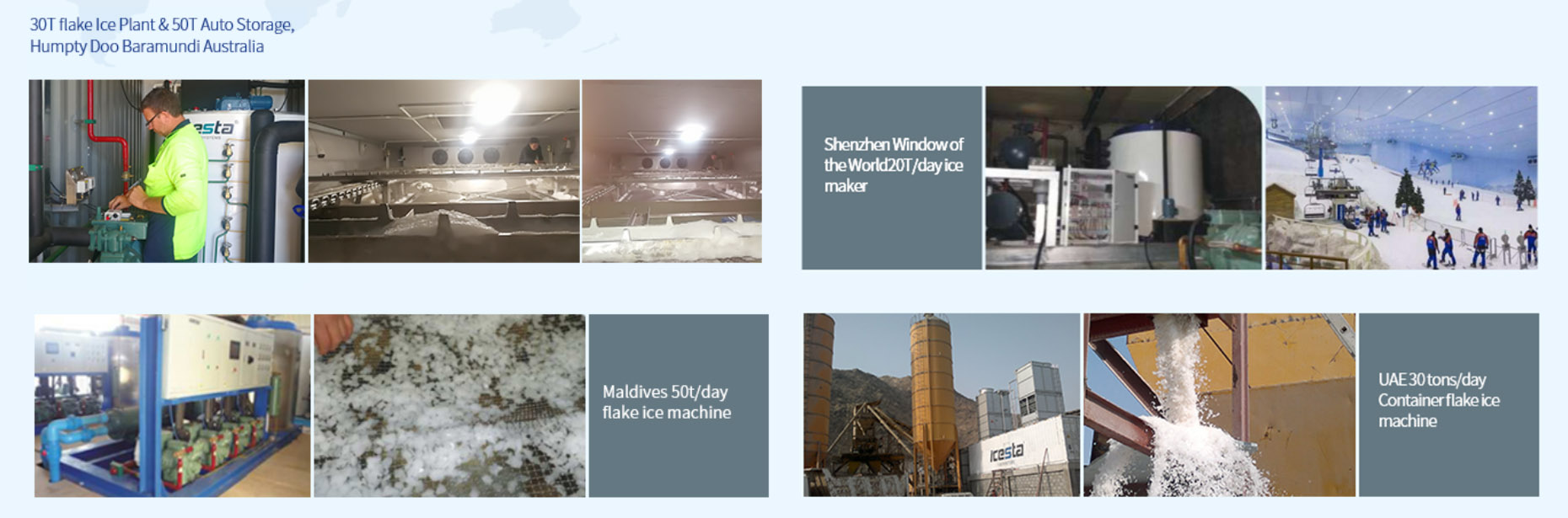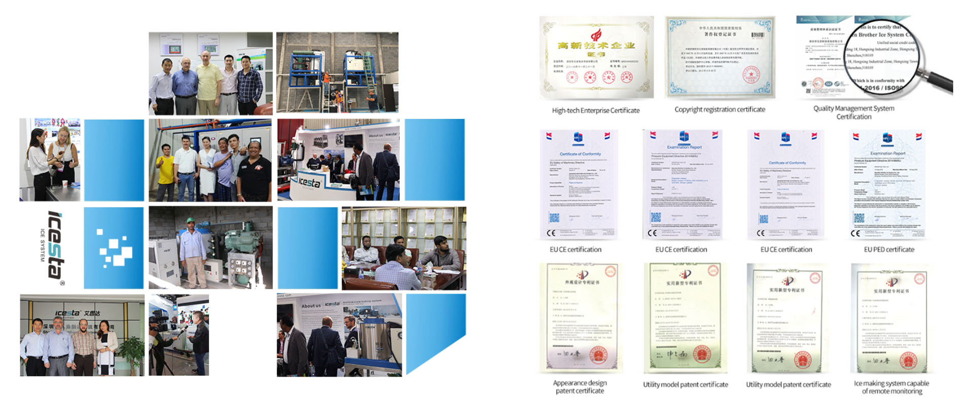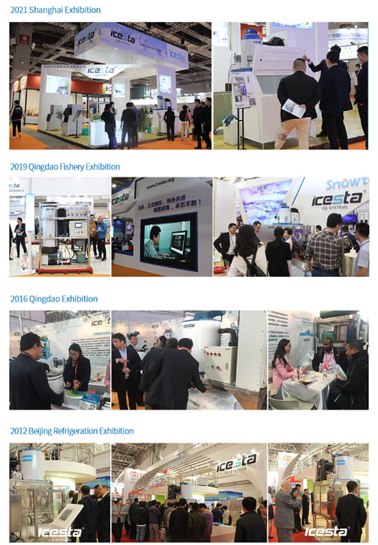 ICESTA's branded ice making equipment, with daily output ranging from 25Kg to 100 tons, is widely used in supermarkets, catering hotels, aquatic products and meat processing, poultry slaughter, leather manufacturing, chemical dyes, concrete construction, ocean fishing, artificial ski resorts, etc. industry. So far, ICESTA has obtained more than 40 national new patents, and has passed the European Union CE safety standards and PED pressure vessel certification, American AMSE certification, ISO9001 quality management system certification, national high-tech enterprise certification, etc., serving more than 80 customers worldwide Countries and regions.