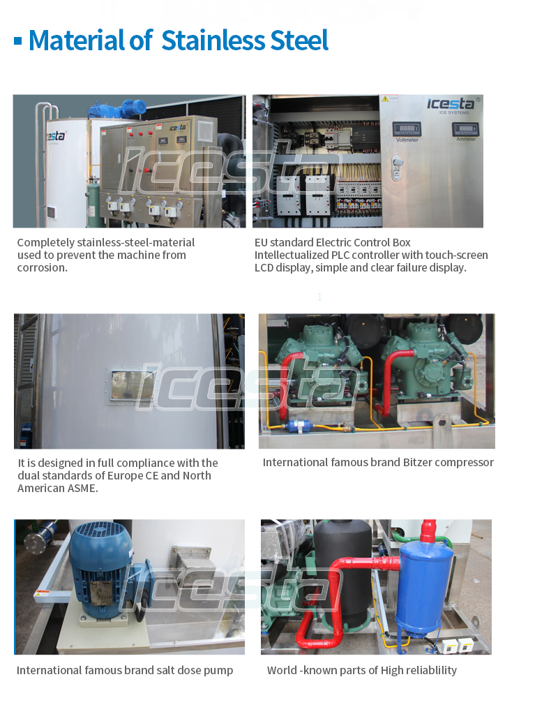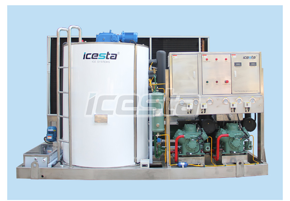 The ICESTA customized seawater flake ice machine for land use, its special design and completely stainless-steel-material used to prevent the machine from corrosion and get easy ice cutting.